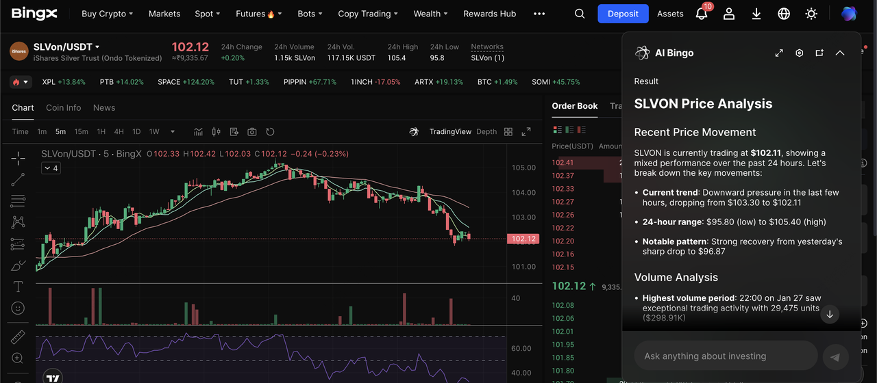 SLVon/USDT trading pair on the spot market powered by BingX AI insights