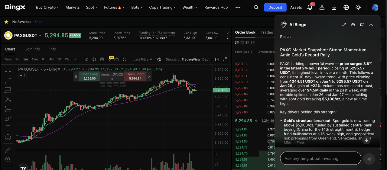 Powered by BingX AI, the platform combines real-time market data, trend signals, and risk indicators to help you trade precious metals with greater precision, whether you prefer unleveraged spot exposure or active futures strategies.