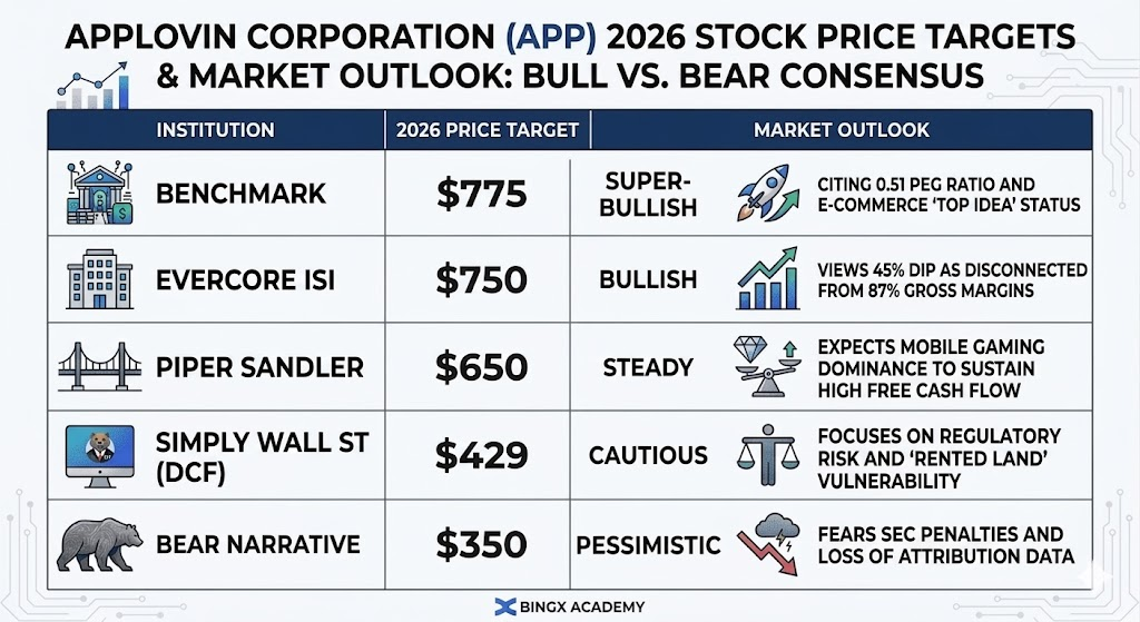 Цей посібник розбирає прогноз ціни акцій AppLovin на 2026 рік, використовуючи дані від Evercore ISI, Benchmark та Piper Sandler. Ви також дізнаєтесь, як отримати доступ до ф'ючерсів акцій AppLovin (APP) через BingX TradFi.